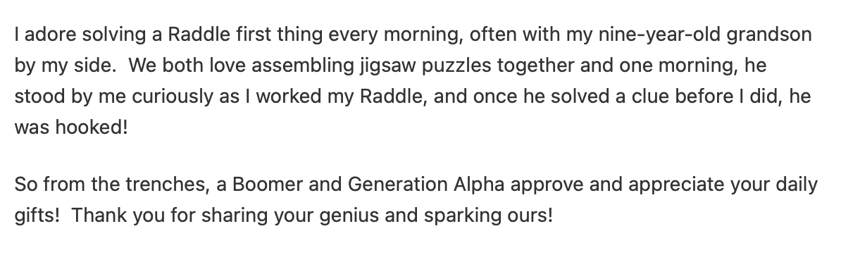 It wasn't my intention to build a game that I would continue to publish every day, indefinitely. But as I went through the daily challenges of Enigmarch, it clicked that I was onto something fun. The clue-writing was satisfying in a way that felt different from crosswords. So when Engimarch ended, I kept going, and Raddle was born.